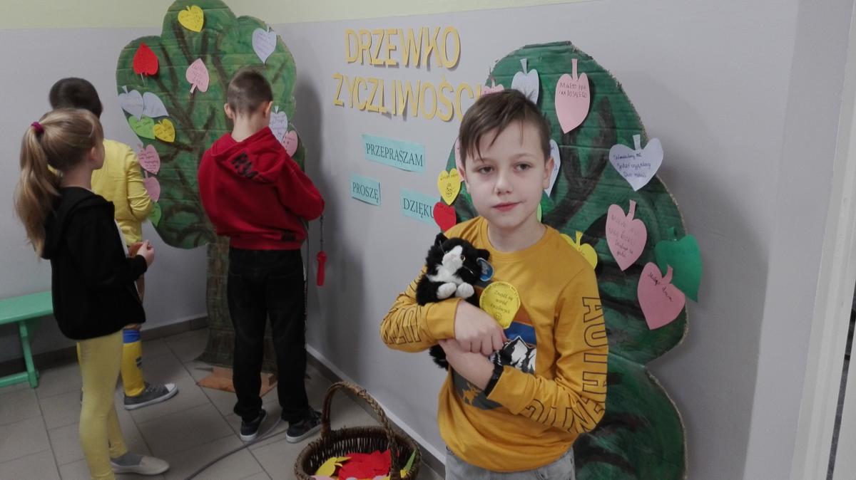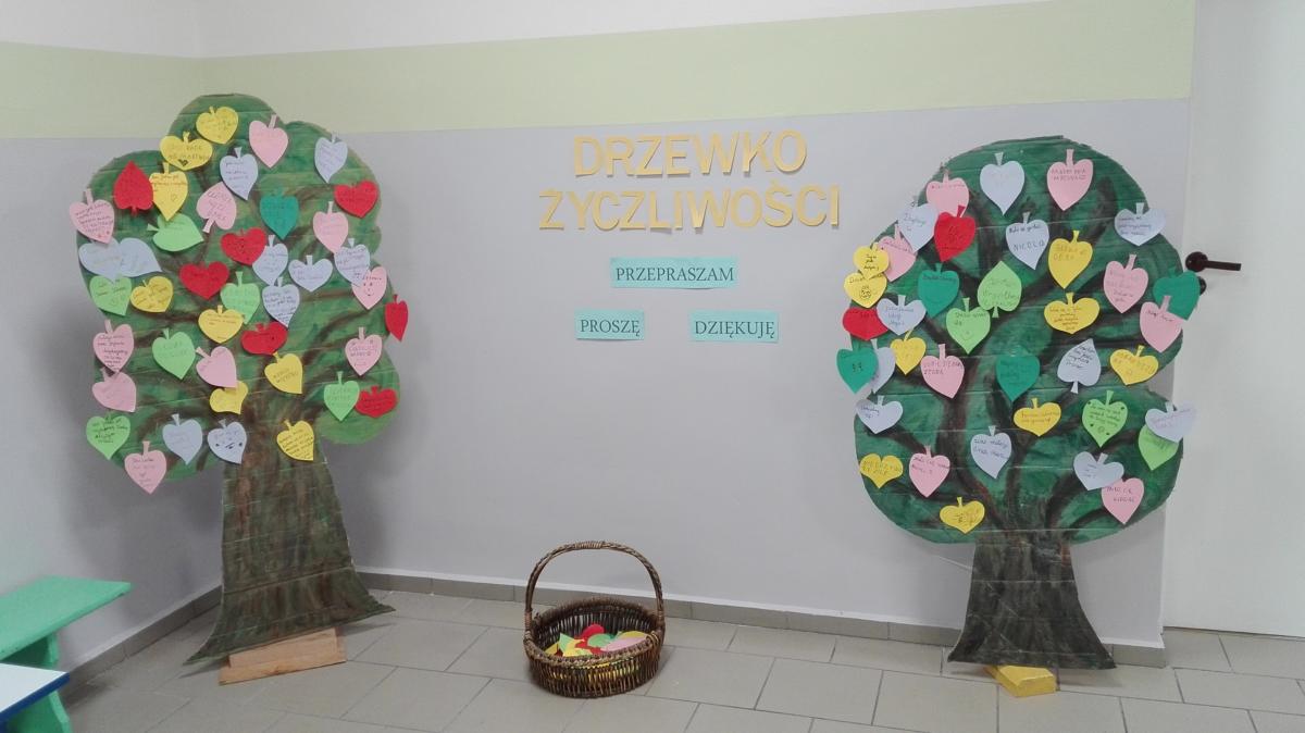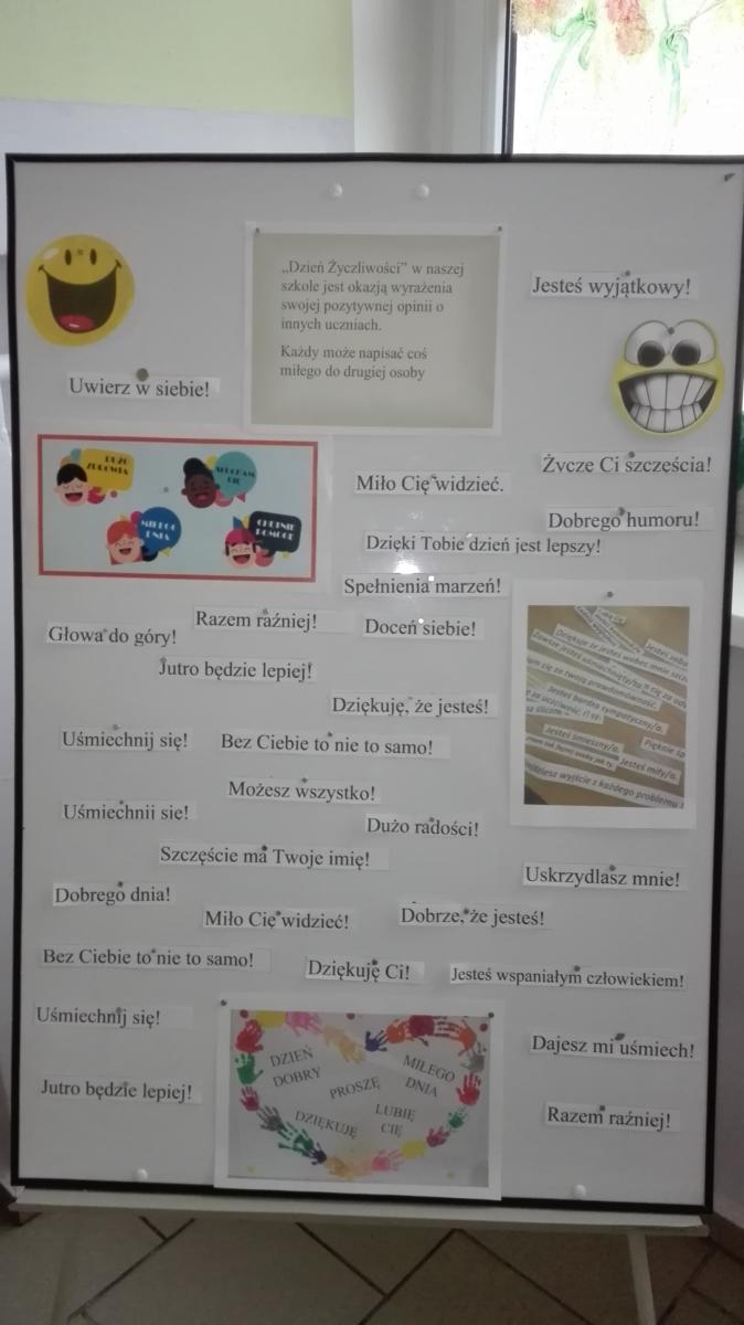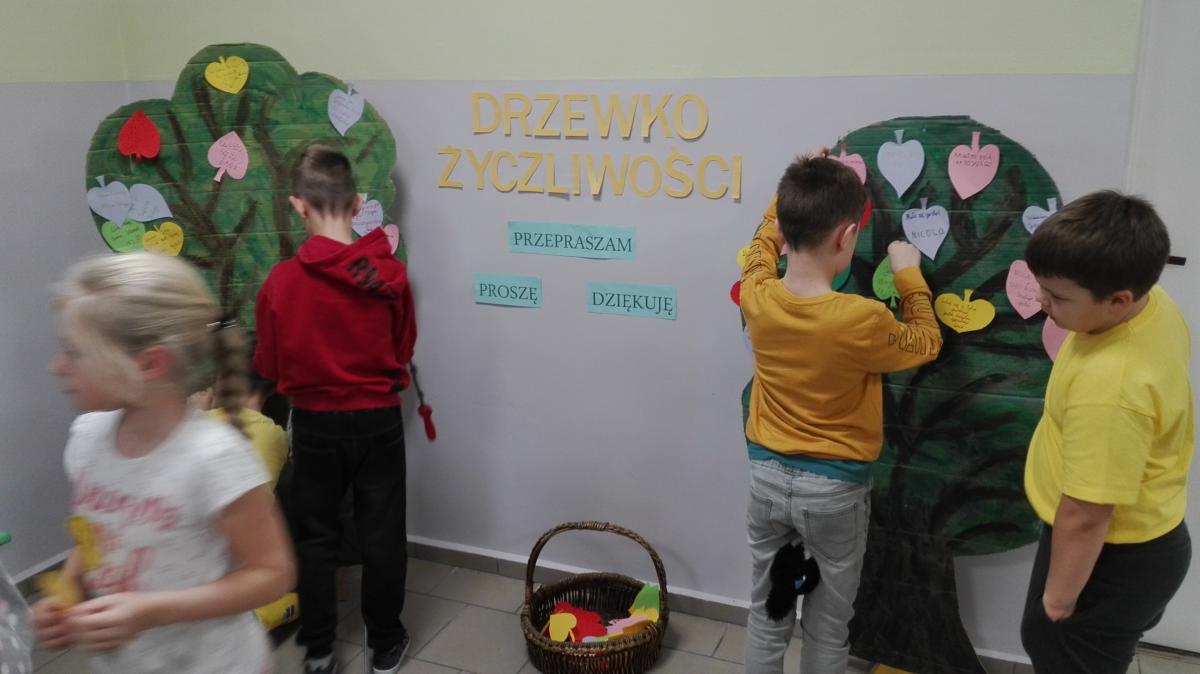 Został także opracowany i umieszczony na korytarzu Kodeks Ucznia Życzliwego. Na korytarzu na piętrze stanęły dwa Drzewka Życzliwości, gdzie na przygotowanych kolorowych listkach każdy mógł napisać życzliwe, ciepłe słowa do wybranych osób, a potem zawiesić je na drzewku. Jeśli komuś brakowało słów, mógł poszukać podpowiedzi na tablicy pt.” Weź ze sobą miłe słowo”.