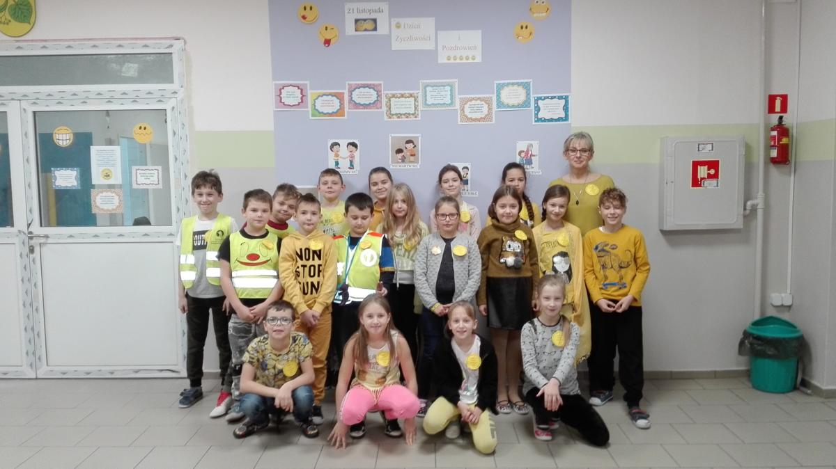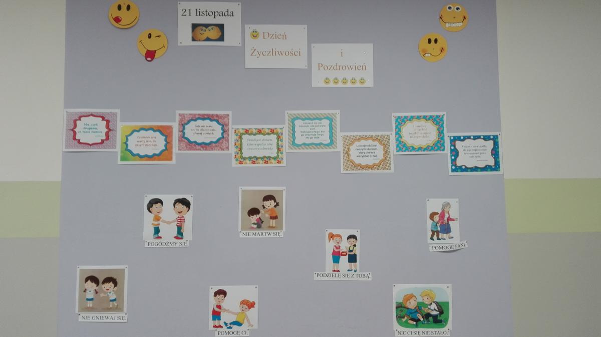 Był to dzień wyjątkowy; pełen uśmiechów, miłych słów, gestów, pozytywnych emocji. Obfitował w różne atrakcje. Na dobry początek każdy otrzymał „uśmiechniętą buźkę. Szkoła została udekorowana wesołymi minkami, informacjami na temat życzliwości, jak ją okazywać w różnych sytuacjach i miejscach m. in. w szkole, w domu, w sklepie, na ulicy, czy w autobusie.
