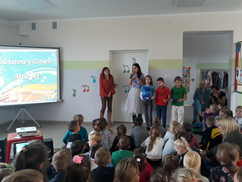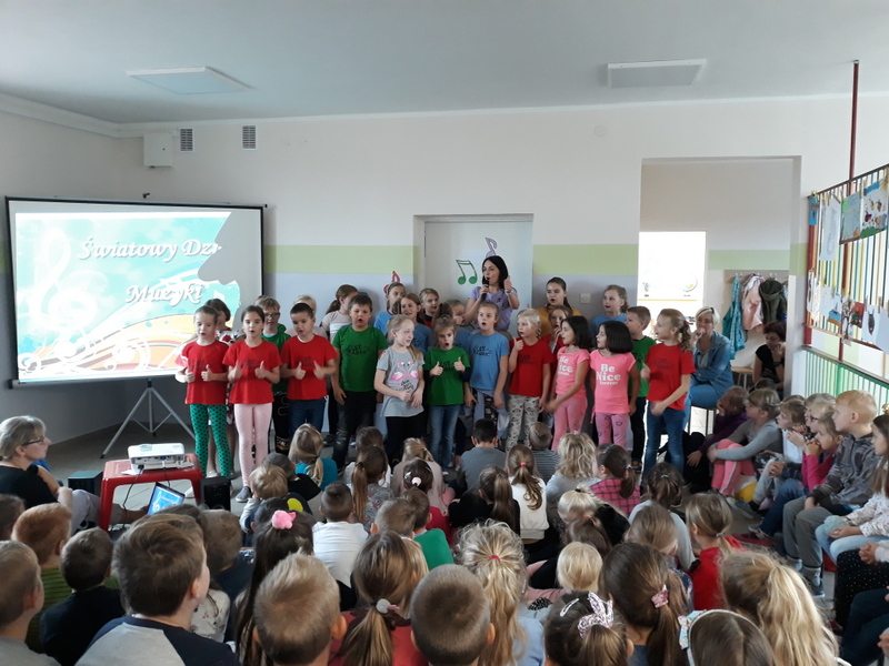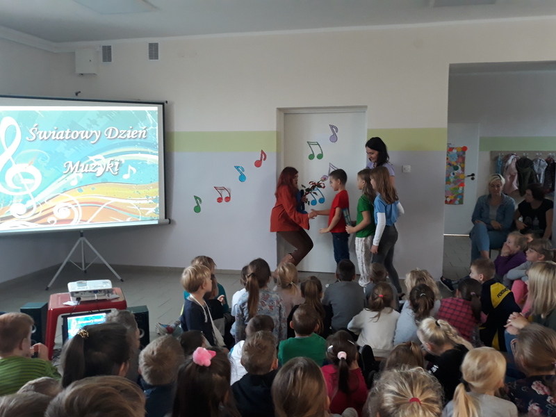 W tym dniu dzieci korzystały z różnych muzycznych stref, które zostały specjalnie dla nich przygotowane : MUZYCZNY KĄCIK (szkolne gitarzystki uczące się gry w Gminnym Ośrodku Kultury w Lipce), TAŃCE-POŁAMAŃCE (improwizacje muzyczne, choreografie taneczne, zabawy z chustą animacyjną), MUZYKA W KOLORACH TĘCZY („malowanie muzyki” na stretchu przy jazzowych rozrabiankach). Mimo szarugi za oknem, muzyka rozpromieniła ten dzień w naszej szkole i pozwoliła na ponowne odkrycie jej cudownej mocy.