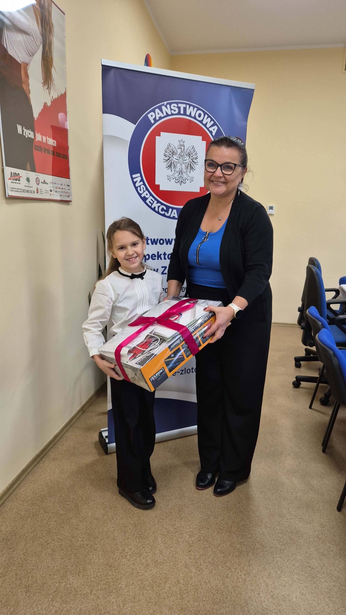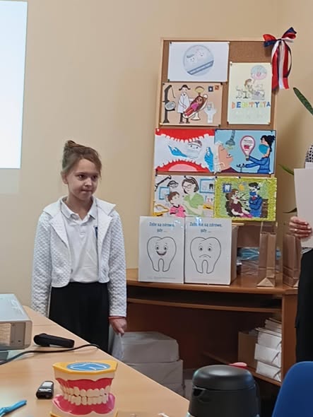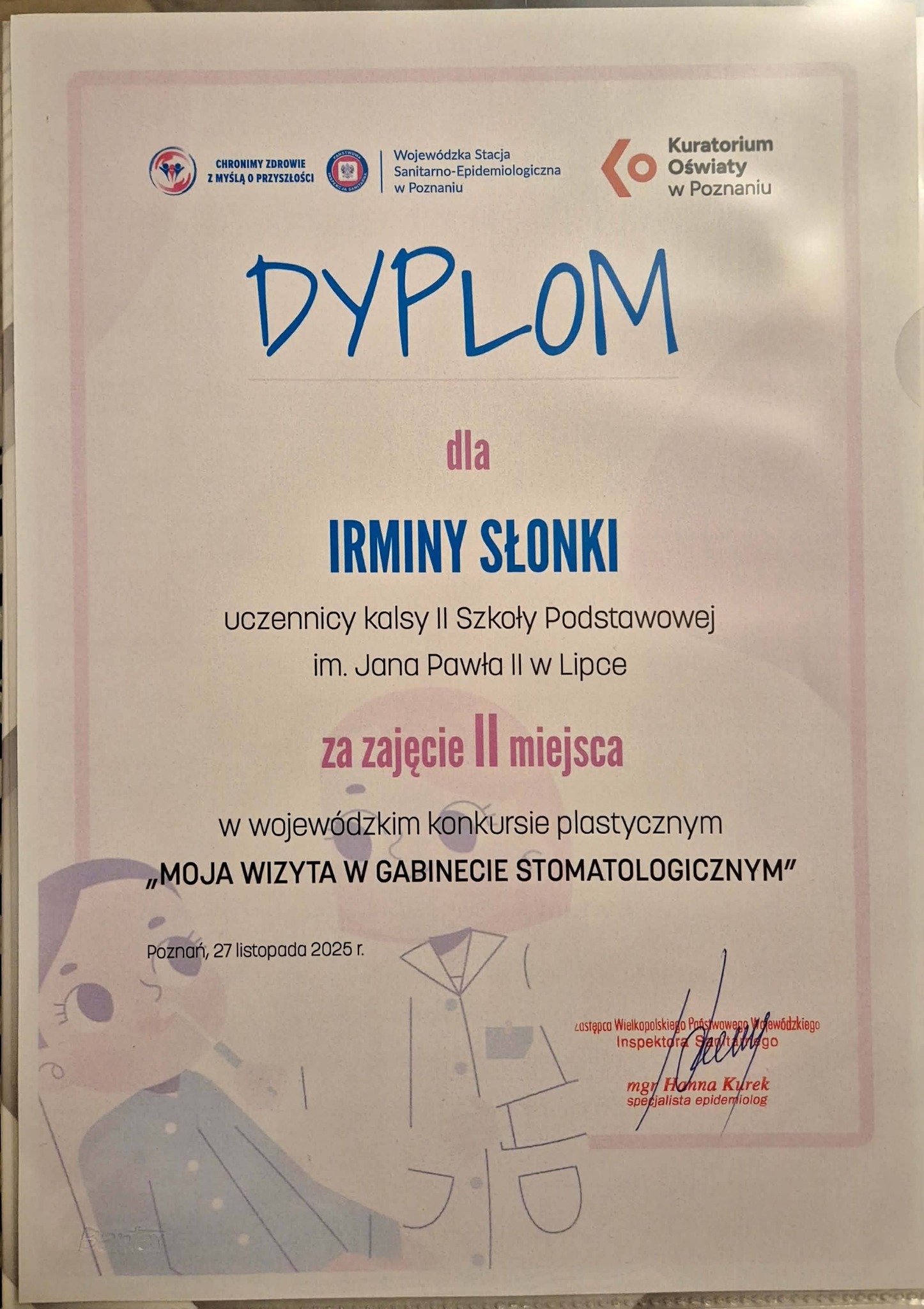W dniu 22 grudnia 2025r. w siedzibie Powiatowej Stacji Sanitarno-Epidemiologicznej w Złotowie uczennica klasy drugiej Irmina Słonka odebrała nagrodę za zajęcie II miejsca w Wojewódzkim konkursie plastycznym „Moja wizyta w gabinecie stomatologicznym” organizowanym przez Wojewódzką Stację Sanitarno-Epidemiologiczną w Poznaniu. Serdecznie gratulujemy! ????