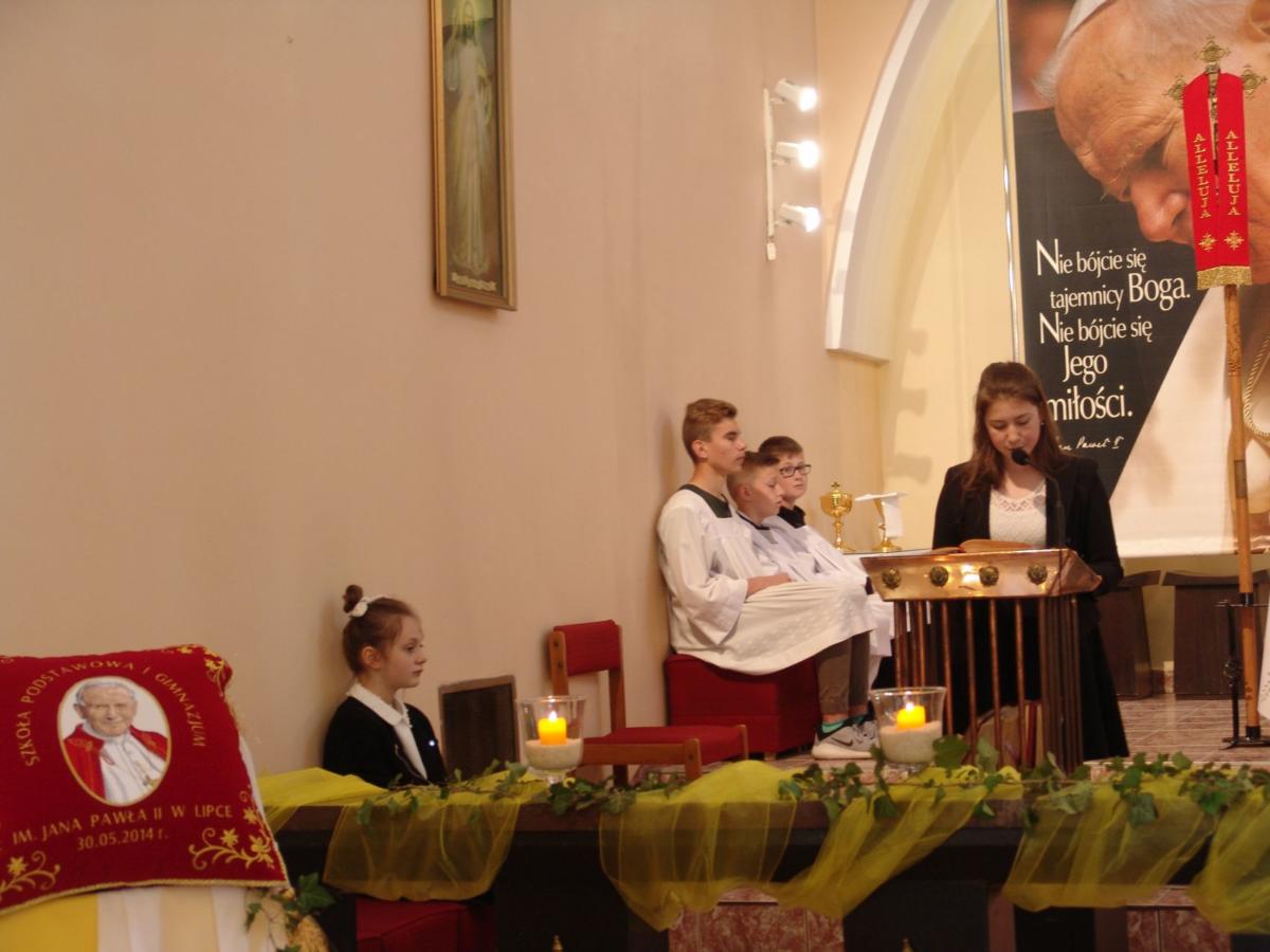 Święto Szkoły Podstawowej im. Jana Pawła II w Lipce rozpoczęło się uroczystą mszą za zmarłych nauczycieli, uczniów i pracowników szkoły. Mszę uświetniły pieśni o patronie wykonane przez chór szkolny „Gama” p. Anety Gortat- Kruk oraz „Gordonki” p. Sylwii Pyrc.